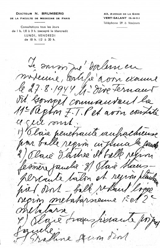 Je soussigne docteur en médecine certifie avoir examiné le 27/08/944 M. DIVE Fernand dit Gourget commandant la 11ème région FTP et avoir constaté ce qui suit.