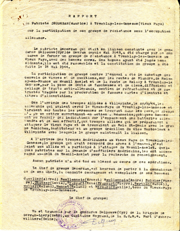 Rapport du Résistant Maurice Decorzant, chef du goupe de Résistance du Vieux-Pays