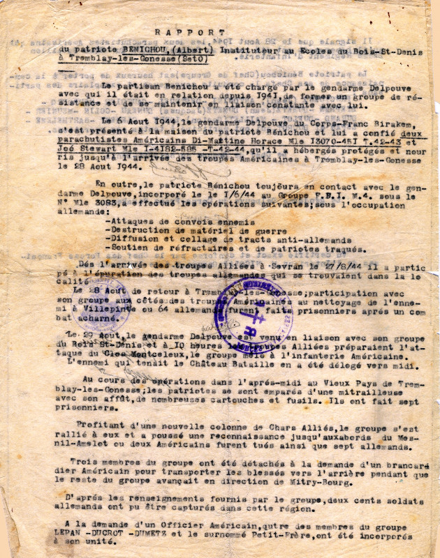 Rapport du résisant Albert Bénichou, chef de groupe des Résistants du quartier des Cottages-Bois-Saint-Denis