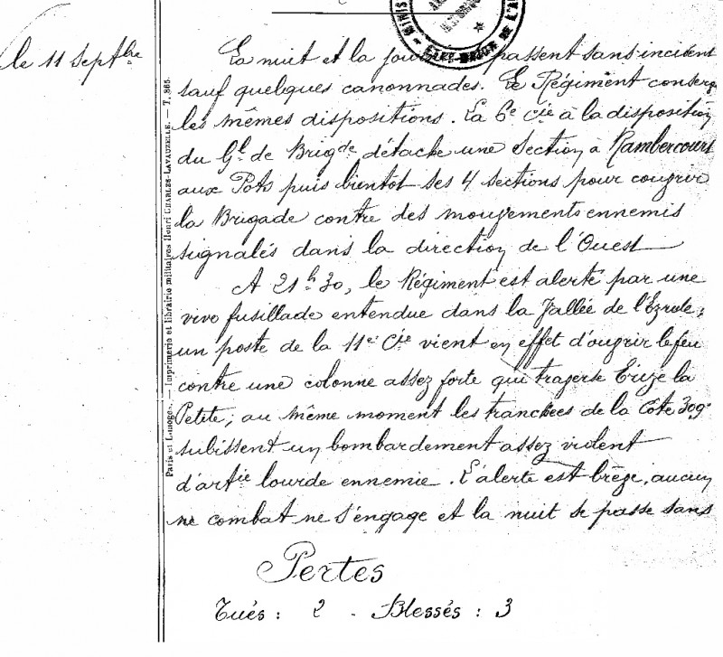Extrait du Journal de Marche et des Opérations du 67e régiment d’infanterie : Journée du 11 septembre 1914