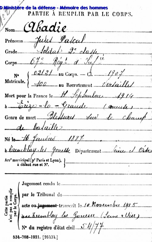 Jules, Pascal Abadie est né à Tremblay-lès-Gonesse le 16 janvier 1887. Il a des yeux bleus, des cheveux noirs, un menton rond. Il est de taille moyenne pour son époque et mesure un mètre soixante-cinq. Il a effectué son service militaire du 8 octobre 1908 au 1er octobre 1910 et a été rappelé à l’activité le 2 août 1914. Il a rejoint alors son régiment, le 67e d’infanterie.