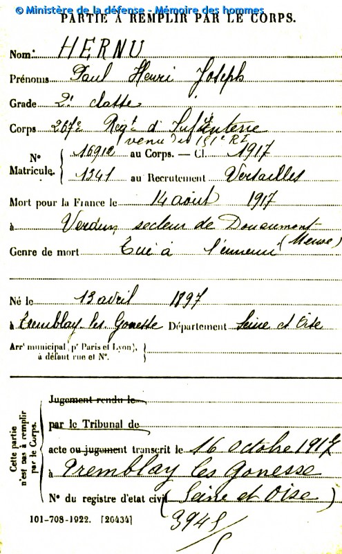 Inscrit sous le n° 91 du canton de Gonesse Paul Hernu est classé dans la 1ère catégorie de la liste par le Conseil de révision de la classe 1915. Incorporé au 151e régiment d’infanterie à compter du 1er janvier 1016, il arrive au corps le 12 janvier 1916. Muté au 267e régiment d’infanterie le 2 avril 1914, il est tué le 14 août 1917 au ravin de Helly, secteur de Douaumont.