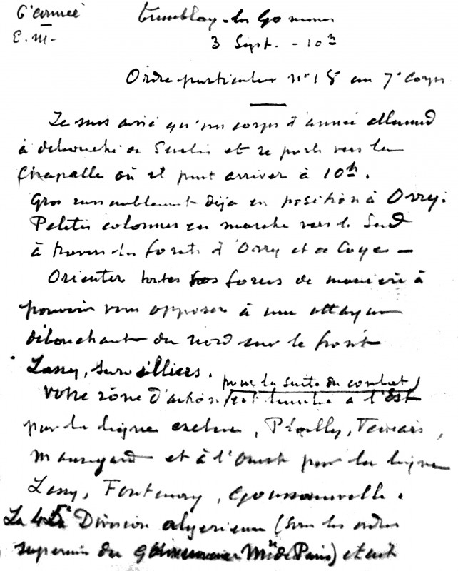 Ordre particulier n° 18 au 7ème corps, daté de Tremblay-lès-Gonesse, le 3 septembre 1914 à 10 heures, signé Guillemin, chef d’état-major, contresigné Maunoury. Cliché SEHT. (Service Historique de la Défense 19N1039)