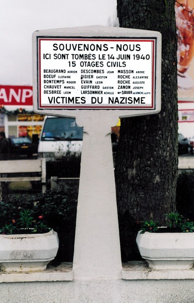 La stèle des fusillés, cliché SEHT, juin 2000. Cette stèle répertoriée au guide Michelin a été depuis modifiée.