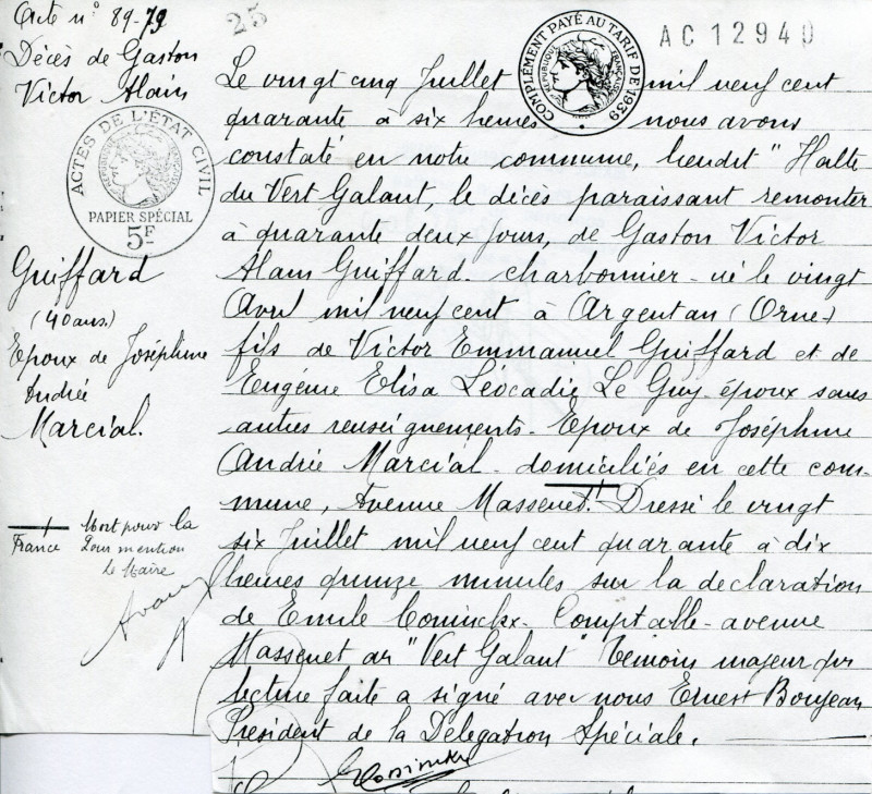 Acte de décès de Gaston, Victor, Alain GUIFFARD, fusillé le 14 juin 1940, exhumé le 22 juillet 1940, état-civil Villepinte