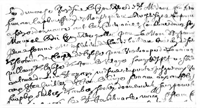 Le dirnanche unziesme, le cymeliére de Sainr-Médard fur réconcilié, suivant la permisssion de Monseigneur l’archeveszque conformément à son ordonnance, avec les cérémonies contenues dans son manuel, le dit cymetière pollué par la mort d’un pauvre jeune homme, Me chertier de Claude Boileau, tué; en descendant er sortant du clocher de l'église par une troupe de Lorraings, pillang l'église et tout le village sang respect ny reverence aulcune du lieu saint et ayans mesme emporté jusque aux vaissaux aux saintes huilles et tout le cierge servant aux authelgs, simples aubes et autres sortes d’ornementz : sang pourtant avoir défoncé le saint tabernacle mais (…)