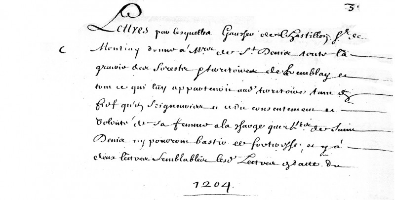 Chapitre XXVII – « En ce chapitre sont inventoriez les titres des terres et seigneuries de Tremblay, Villepinte, Mortières, etc. Lettres par lesquelles Gaucher de Chastillon seigneur de Montjay donne à Mre de St-Denis toute la gruerie des forest scises au territoire de Tremblay et tout ce qui lui appartenoit audit territoire tant en fief qu’en seigneurie et ce du consentement et volonté de sa femme à la charge que Mre de St-Denis n’y pourront bastir de forteresse, et y a deux lettres semblables, lesdites lettres en date du 1204 ».
